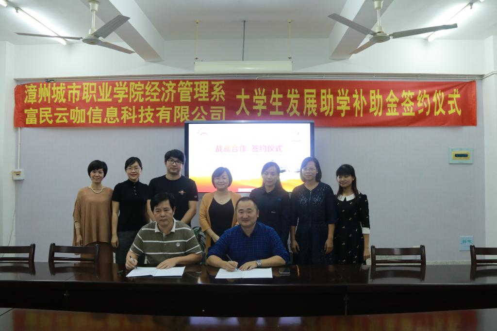 10月24日下午,福建富民云咖信息科技有限公司董事长郑旺泉 一行三人到我系参访交流,并与我系签订老员工发展助学补助金协议,系主任张少华和富民云咖信息科技有限公司董事长郑旺泉分别在协议书上签字。