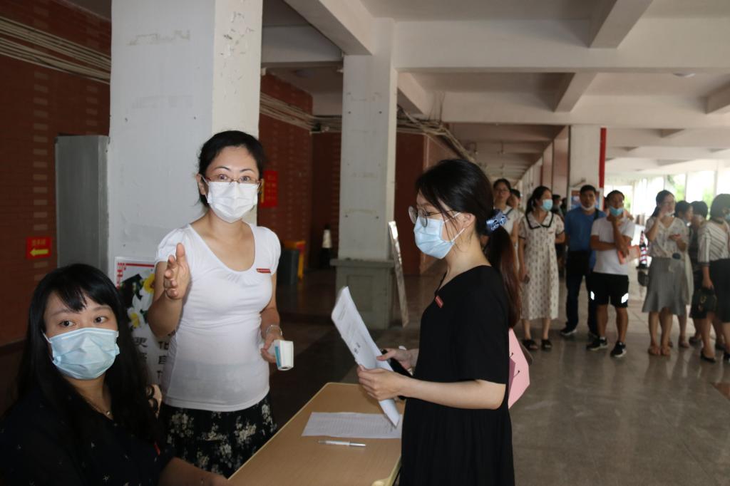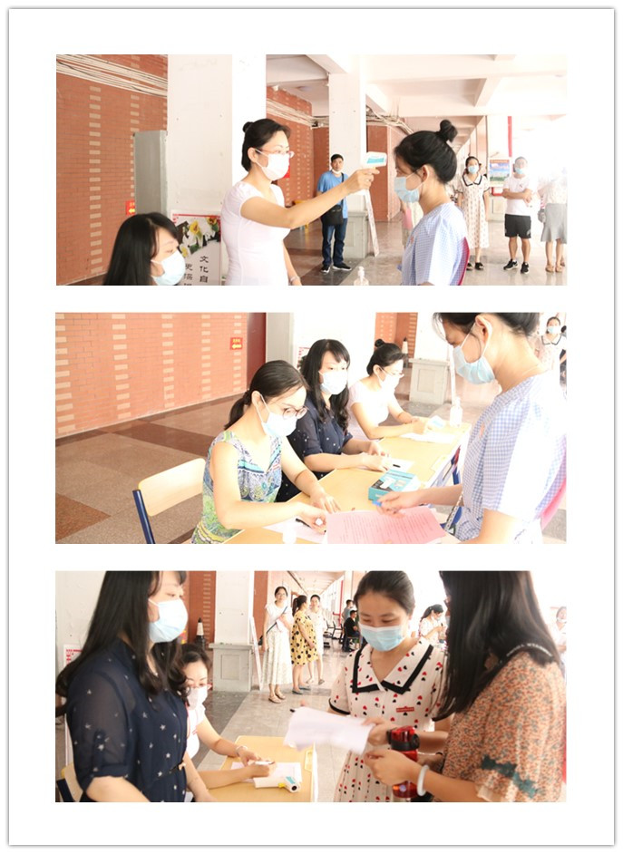 在工作人员引导下员工到达报到处,佩戴口罩进入所属班级报名通道等候报到,并与前人保持一米的距离。工作人员用免洗洗手液对员工进行手部消毒,而后对其测额温、核验健康码(绿码)并做好登记;随后,对员工进行信息核查并登记,收取《员工个人健康承诺书》、《返校通知单回执》或《核酸检测报告》等;向员工发放防疫物资,引导完成报到的员工从出口通道离开。