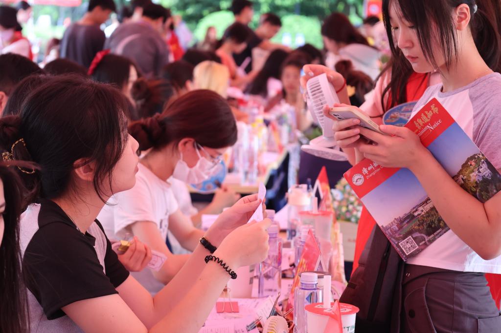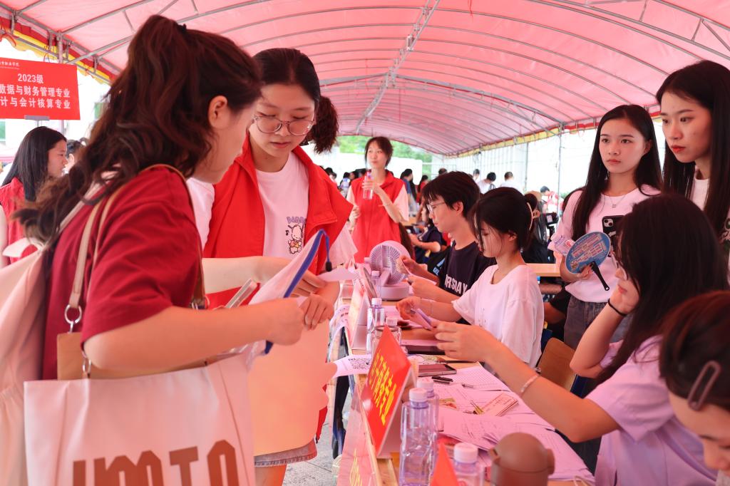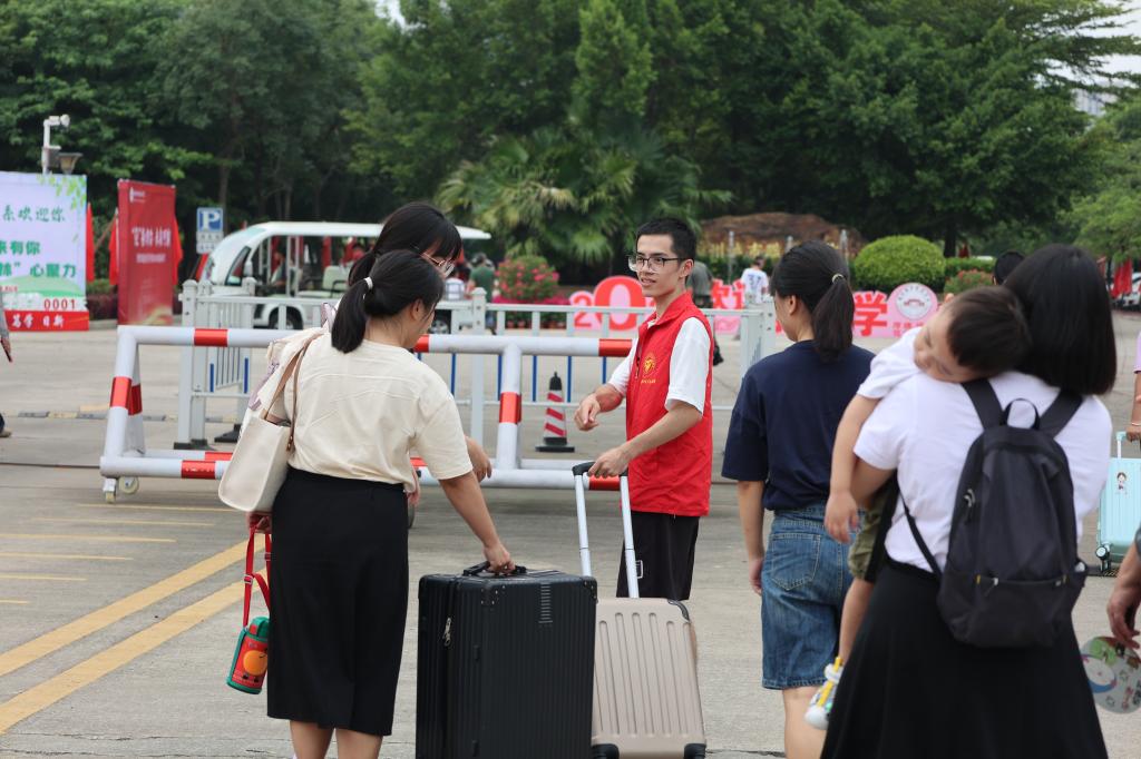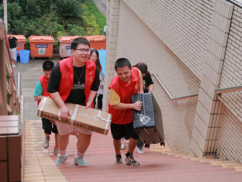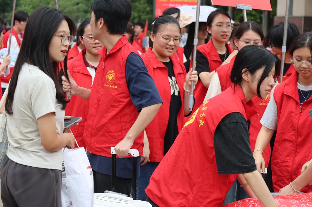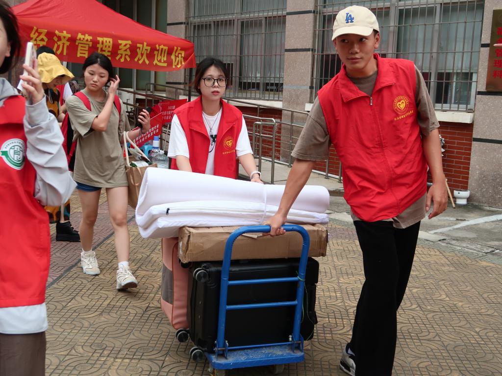 青年志愿者们身穿红色马甲挥汗如雨,往返奔走在迎新服务点与新生宿舍之间。他们积极主动地为新生答疑解惑、维持秩序、搬运行李、指引道路,用热情和汗水完成这一场“火辣”的迎新接力赛,为迎新现场增添了亮丽色彩。让初入大学的新生,感受到经管大家庭的温暖。
