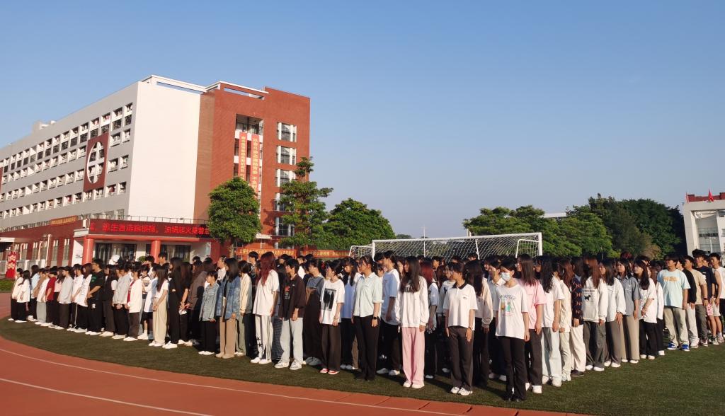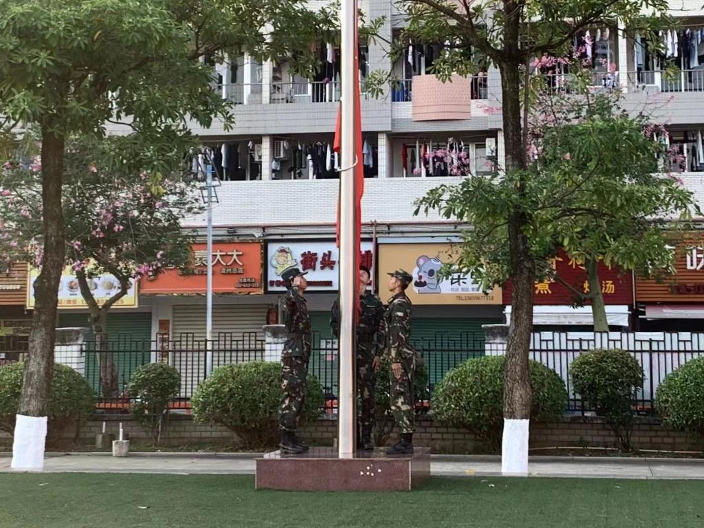 迎着朝阳,国旗护卫队迈着铿锵的步伐,护卫五星红旗入场,庄严地走向升旗台。伴随着国歌的奏响,升旗手庄严肃穆地将国旗缓缓升起。全体师生肃立,面向国旗,齐唱国歌,向国旗行注目礼,深怀对祖国的无限热爱与崇高敬意。
