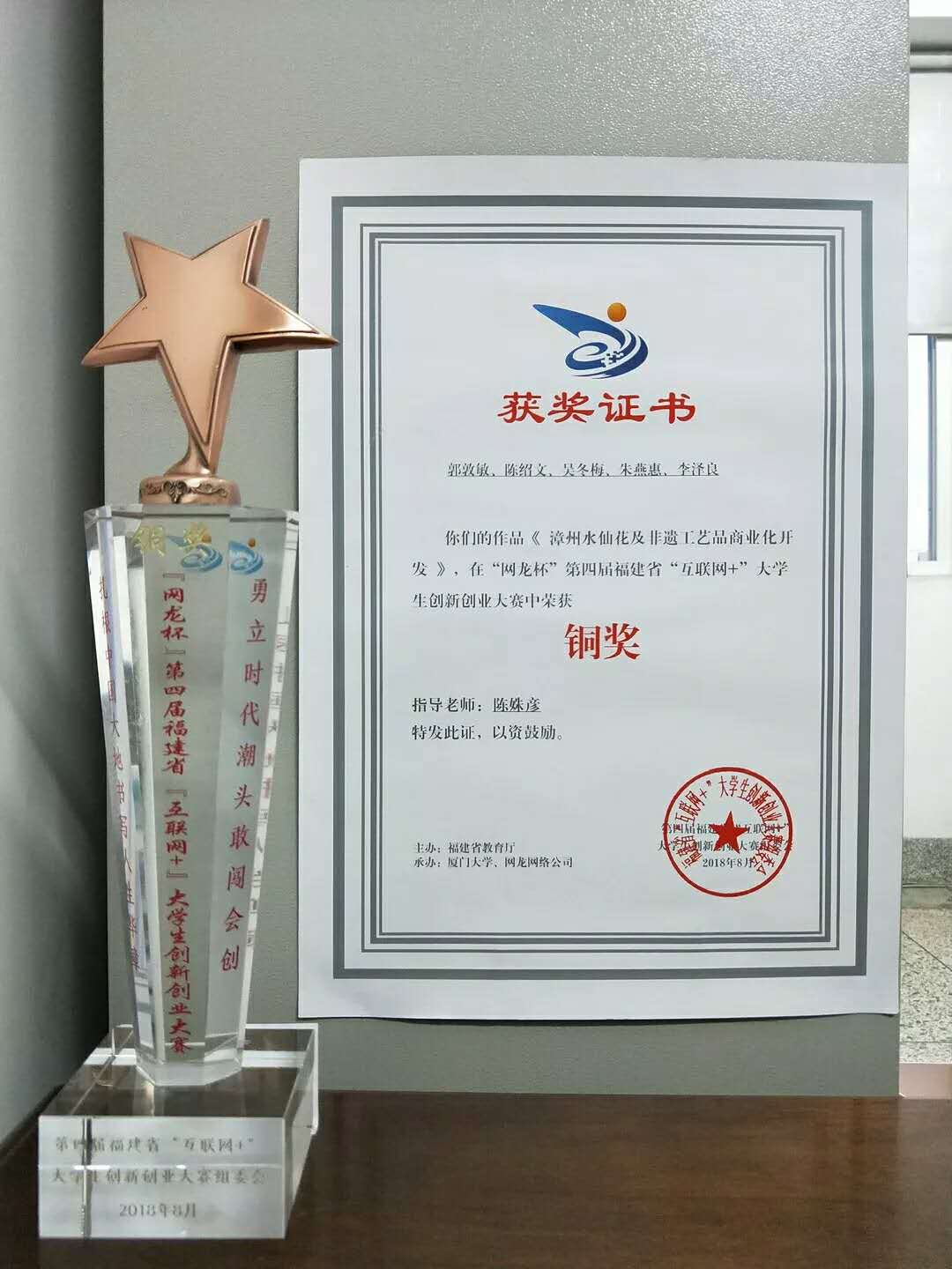 2018年8月27日至28日,“网龙杯”第四届福建省“互联网+”老员工创新创业大赛省级决赛暨颁奖仪式在厦门大学举行,我系选送的创新创业项目--“漳州水仙花及非遗工艺品商业化开发”喜获铜奖。