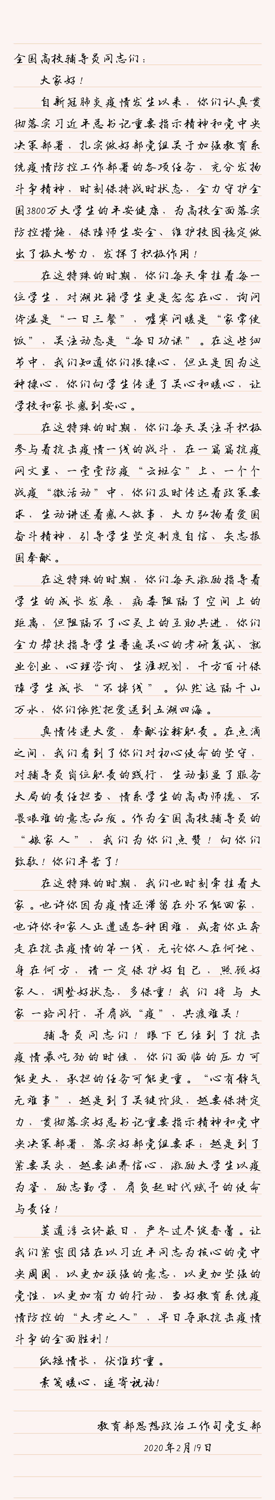 共克时艰 勠力同行 教育部思政司党支部致全国高校辅导员的一封信