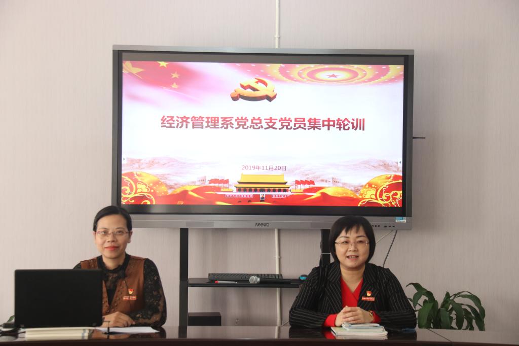 2019年11月20日下午,经济管理系第一党支部书记谢惠茹在系会议室为经济管理系党总支全体党员上专题党课。党课由经管系党总支书记吴李霞主持。