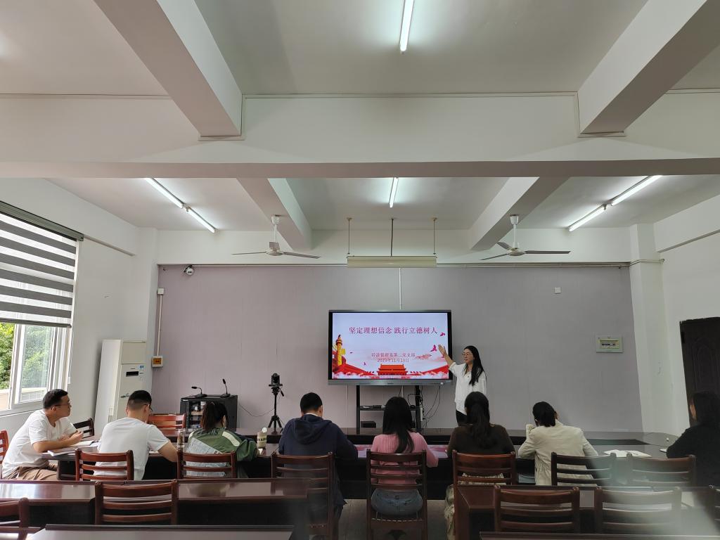 2023年11月13日,经济管理系第二党支部书记柯桂芳在系会议室作题为《坚定理想信念 践行立德树人》的专题党课,扎实推进学习习近平新时代中国特色社会主义思想主题教育,支部全体党员参加学习。