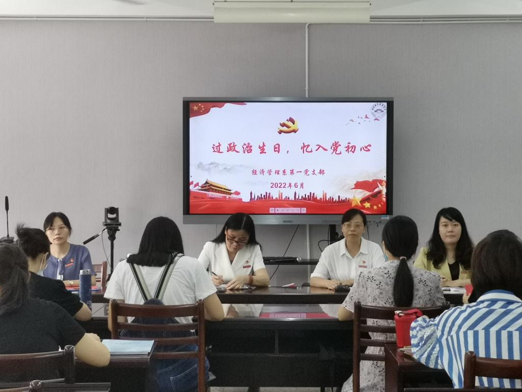 2022年6月29日上午,bw必威西汉姆联官方网站经济管理系第一党支部在系会议室开展“过‘政治生日’忆入党初心”主题党日活动,为入党日期在第二季度的10名党员同志集体过“政治生日”。